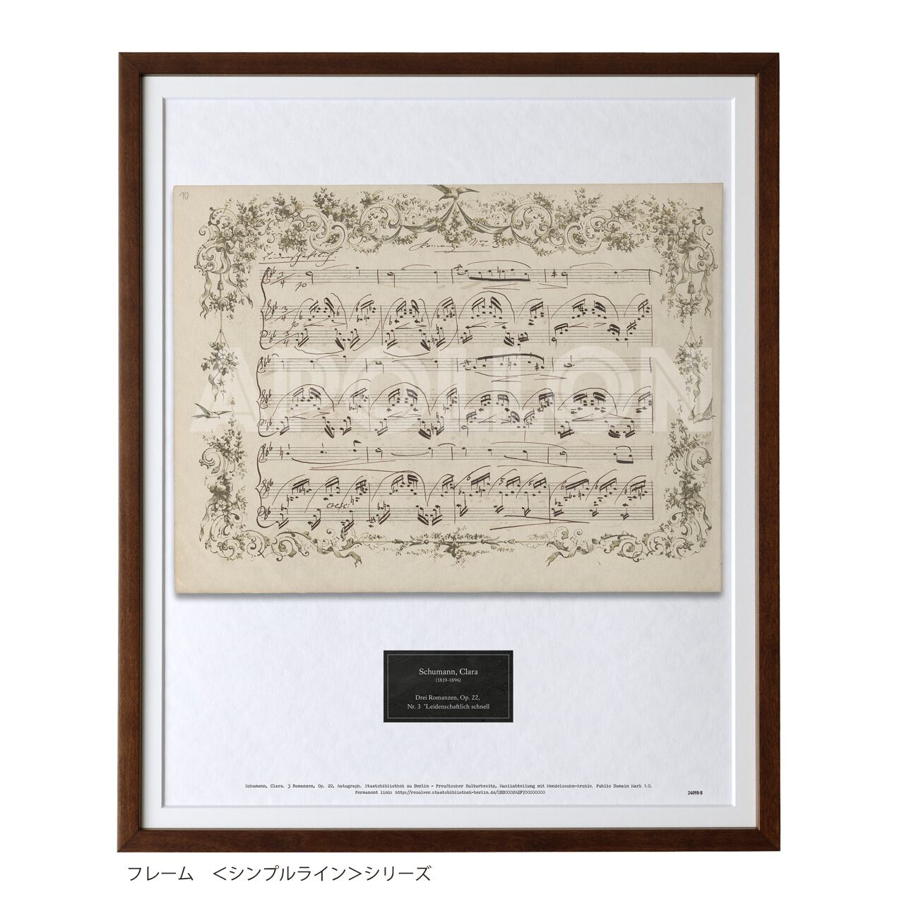 クララ・シューマン 自筆譜アートフレーム:ピアノとヴァイオリンのための3つのロマンス 第3曲 Op.22-3