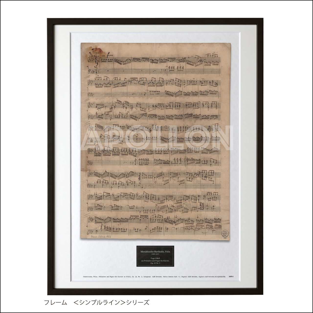 メンデルスゾーン 自筆譜アートフレーム:フーガ ヘ短調(ピアノのための《前奏曲とフーガ》 作品35-5 より)