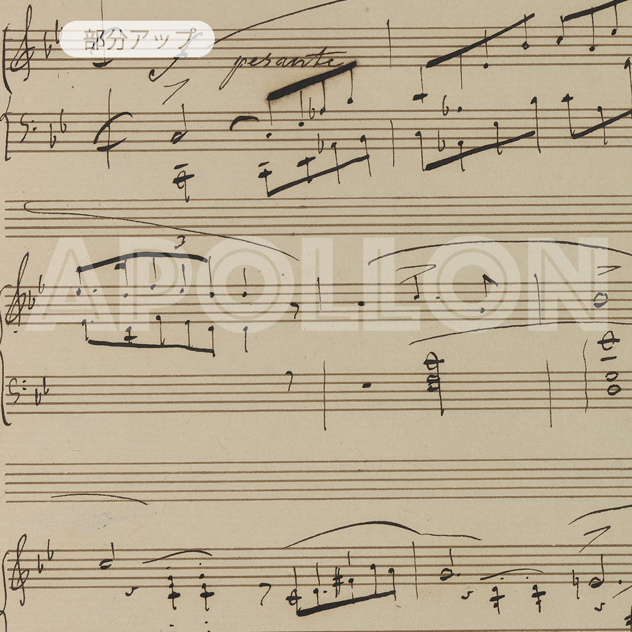 また、作品によっては裏面の楽譜が透けて見える部分がございますが、これは所蔵先のスキャニングデータに由来するもので、実際の自筆譜原本において裏写りが生じているものと考えられます。当店では可能な限り忠実に再現しておりますので、何卒ご理解・ご承知おきくださいますようお願い申し上げます。
